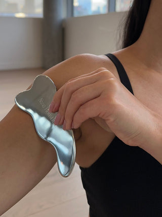 Arms: Start at the wrist and glide upward toward the shoulder to stimulate circulation and ease muscle tension. Use the long side of the Gua Sha for smooth strokes along your forearms and biceps.